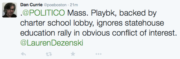 To my eye, the design of the “ads” that infiltrate the Playbook emails are nearly indistinguishable from the layout of news content. So I tweeted this simple statement of fact Monday morning: “”POLITICO Massachusetts Playbook” sponsored by state charter school lobby.” Moments later I noticed that the Playbook link to the charter lobby website was not working. So I brought that to Politico’s attention in another tweet. A short time later I received a message from @LaurenDezenski in which she explained that, actually, a mistake had been made. The Great Schools Massachusetts Playbook ads were not supposed to start running until the next day (Tuesday). Consequently, the Monday ads with the unready links were taken down. Lauren also explained that there is a strong firewall between business and editorial in the Playbook and that she, as Politico’s reporter, has nothing to do with any of the advertisements. And I respect that that is undoubtedly true as far as she is intends to be concerned.