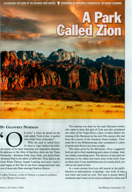 This time it’s the estimable Geoffrey Norman (who wrote the first piece in the Xanterra aditorial series, Death Valley Days) laboring once again in the fields of the lowered with this piece about Zion National Park.