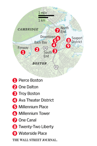 A digital “Twitter wall” flashes trending neighborhood topics inside the lobby of a new high-rise in the theater district. A freshly built luxury building across town lures affluent young professionals with sunset yoga and hip-hop parties on the pool deck. Downtown, one of San Francisco’s best known restaurateurs, Michael Mina, will craft a new entree every month for residents of a sleek condo tower. And homeowners at a glass skyscraper set to open in 2018 will be able to sip cocktails in private “sky cabanas” overlooking a rooftop pool. They may need to look out the cabanas’ glass walls to remember what city they’re in—Boston.