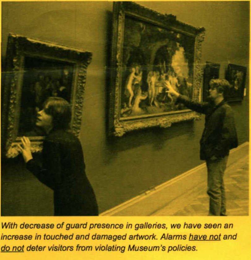 [A]ccording to Steve Keller, a museum security consultant with Architect’s Security Group in Florida, the MFA is in the forefront of a broader trend among museums to adopt technologically advanced security systems. Keller, who said he was briefed on the MFA’s security system at a conference this year at the Smithsonian, said the museum uses a predictive video monitoring system that incorporates ceiling-mounted cameras and video analytics to sound an alarm before a person actually touches an artwork.