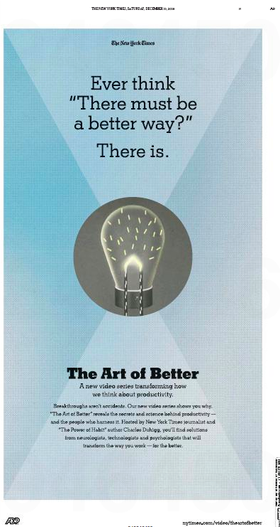Let’s start with Saturday’s edition. Here’s an ad for a new Times video series called The Art of Better that “reveals the secrets and science behind productivity.”
