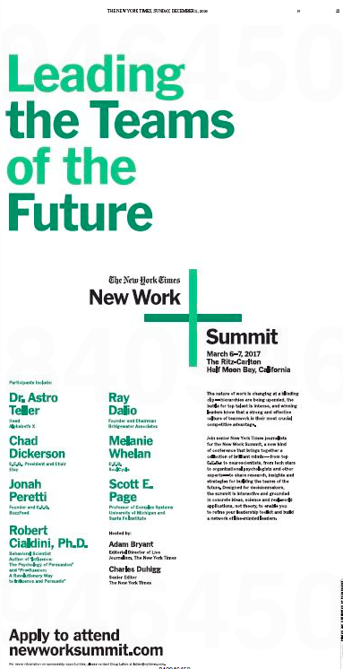 Okay, so that was Saturday. Let’s move on to Sunday’s edition, which was even more action-packed, starting with this ad for the New Work Summit, “a new kind of conference that brings together a collection of brilliant minds — from top C.E.O.s to neuroscientists, from tech stars to organizational psychologists and other experts — to share research, insights and strategies for building the teams of the future.”