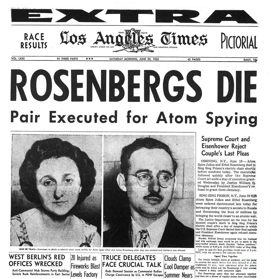Julius and Ethel Rosenberg may have been executed in 1953 for conspiring to pass atomic secrets to Russia, as this Los Angeles Times front page noted.