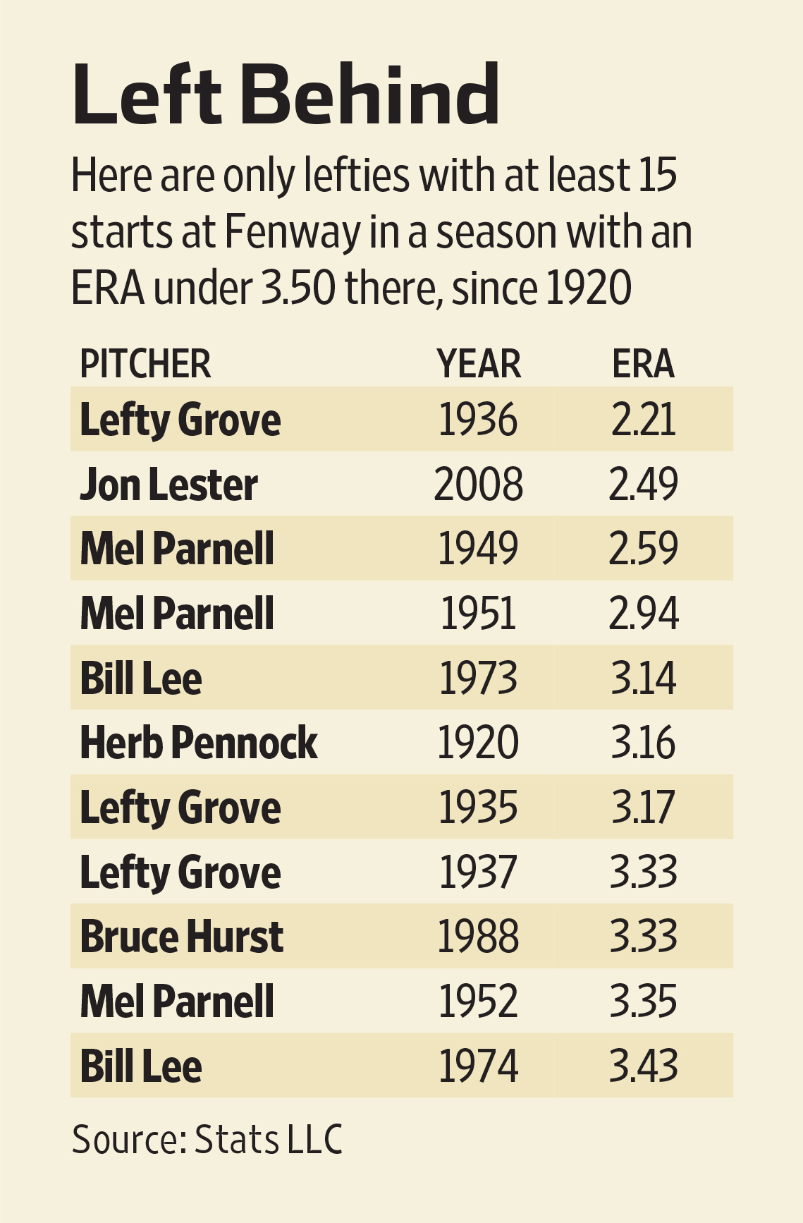 Since 1988, one southpaw has had an ERA under 3.50 at Fenway Park in at least 15 starts there: Jon Lester (2.49) in 2008, according to Stats, LLC. Last year, five-time all-star lefty David Price had a 4.11 ERA there and suffered through a 3.99 ERA overall, his worst season since his rookie year in 2009.
