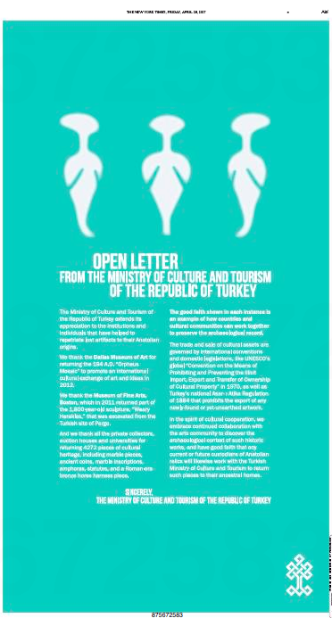 The Ministry of Culture and Tourism of the Republic of Turkey ran this ad in Friday’s New York Times.