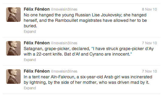 In his work for Le Matin, Fénéon was in many ways the first micro-blogger, so it’s only fitting he has his own Twitter feed.