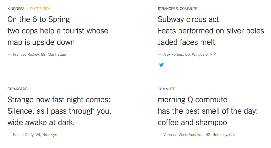For National Poetry Month, The New York Times asked readers to write haiku about the city: three lines of five, seven and five syllables. The response — more than 2,800 submissions in 10 days — was as impressive, and as exhausting, as the city itself. Writers were asked to stick to six subjects: the island, strangers, solitude, commuting, 6 a.m. and kindness. Beyond that, poems could be fashioned from whatever inspiration the five boroughs provided.
