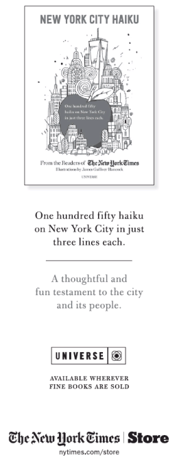 A few months ago the New York Times ran a New York City in 17 Syllables contest, soliciting haikus (three lines of five, seven and five syllables) about the Big Town.