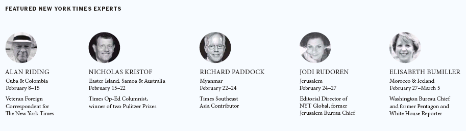 Fly around the world in a customized Boeing 757 jet for the ultimate in luxury travel. Spend 26 days visiting such places as Israel, Cuba, Colombia, Australia, Myanmar and Iceland. Four award-winning New York Times journalists will accompany you, each for several days as you visit areas where they have expertise.