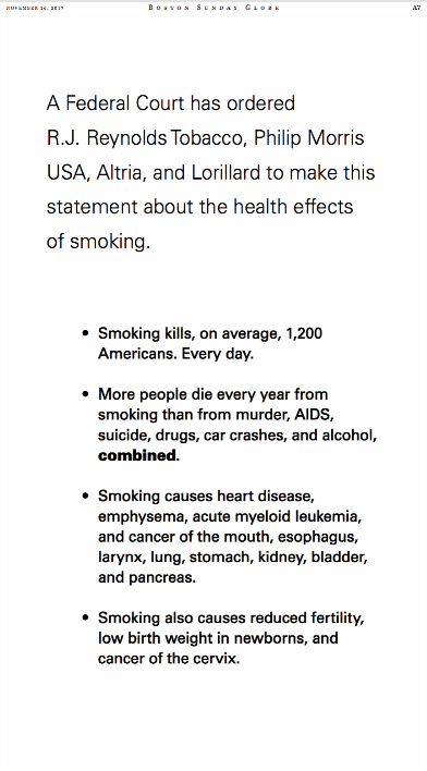 “Their legal strategy is always obstruct, delay, create confusion and buy more time,” said Ruth Malone of the University of California, San Francisco, who has studied the industry for 20 years. “So by the time this was finally settled, newspapers have a much smaller readership and, nowadays, who watches network TV?”