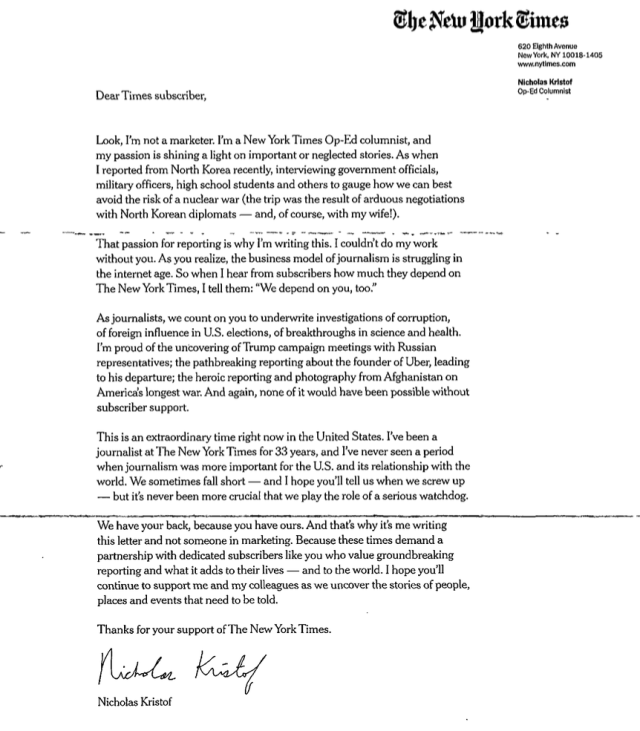 Two things bugged me about the letter. First was Kristof’s presumption that I might be a willing vessel for his gratitude. My relationship with him is more like my relationship to the station manager of the subway—he’s just another interchangeable employee producing a service that I use. I need or want a letter of thanks from Kristof as much as I do one from the station manager for riding the train. The truth of the matter is that I don’t subscribe to the Times so that he can, in his words, shine “a light on important or neglected stories.” I tolerate his heavy moral preening and self-indulgence so that I can read the rest of the Times package. His gratitude is the last thing I want from the paper.