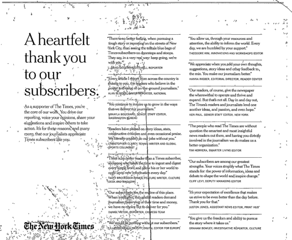 Yesterday’s Times featured this half-page version of the big wet kiss-up.