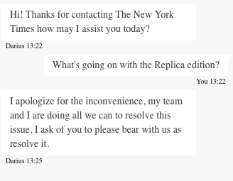 The quality of that screenshot is so poor because the Times’s Replica Edition has been unavailable for the past few months, so we were left to our own devices for the image. Earlier today the hardtsking staff had this exchange with a Customer Care representative.
