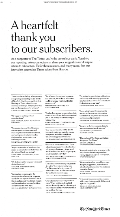 Now the Grey Lady is asking its newsroom staffers to sing for their supper in a series of sycophantic salutes to the paper’s subscribers.