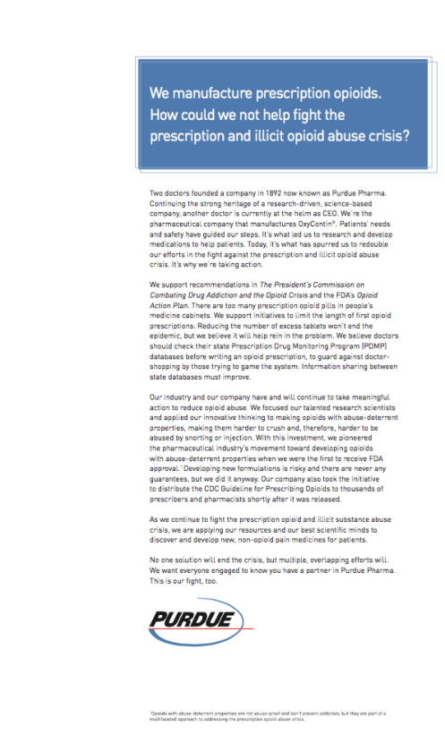 With both the Esquire and New Yorker pieces landing with a big bang (and with multiple cities and counties suing opioid makers), it’s likely no coincidence that Purdue has been running this full-page ad in the New York Times and Wall Street Journal for the past few weeks.
