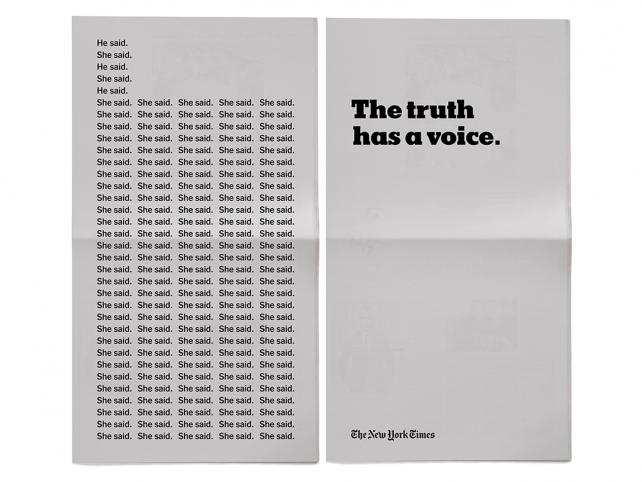 The New York Times is continuing its year-long Truth campaign with this spot on Sunday’s Golden Globes broadcast, spotlighting its coverage of sexual harassers from Weinstein to O’Reilly to dozens more.