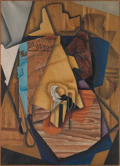 The Man at the Café is the largest collage by Gris, and the only one to feature a human figure. Inspired by the fictional criminal mastermind Fantômas, popular in serial novels and silent films, Gris humorously captured a shady character hiding his face, his fedora casting an ominous shadow. The newspaper article, cut and pasted from Le Matin, reads, “One will no longer be able to make fake works of art,” although Gris himself attempted to trick the eye with the wood-grain paneling of the café interior.