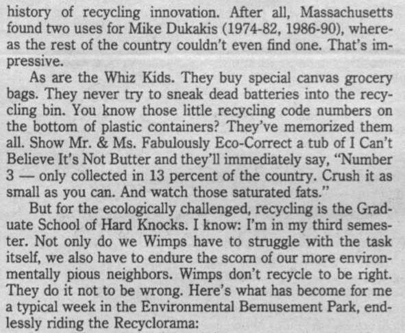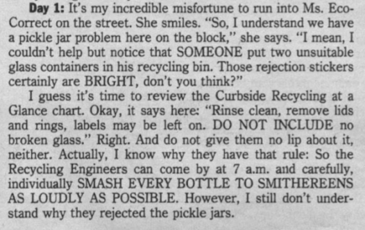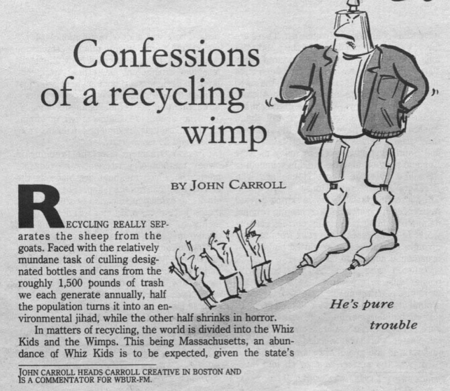 Back in 1991, when curbside recycling was still in its infancy, I wrote a Boston Globe Magazine piece with the headline, “I’m Recycling As Fast As I Can (Label Removed).”