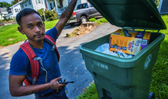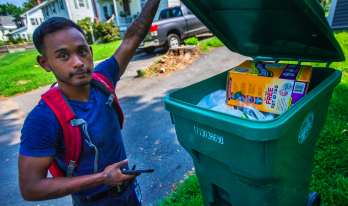 Bora Chhun, 27, is a recycling enforcement coordinator for Lowell. His job is to inspect recycling bins for any contamination. If there are items that shouldn’t be in the bin, he tags it with what’s called an “oops tag,” which is a piece of paper notifying the homeowner of what to not recycle.