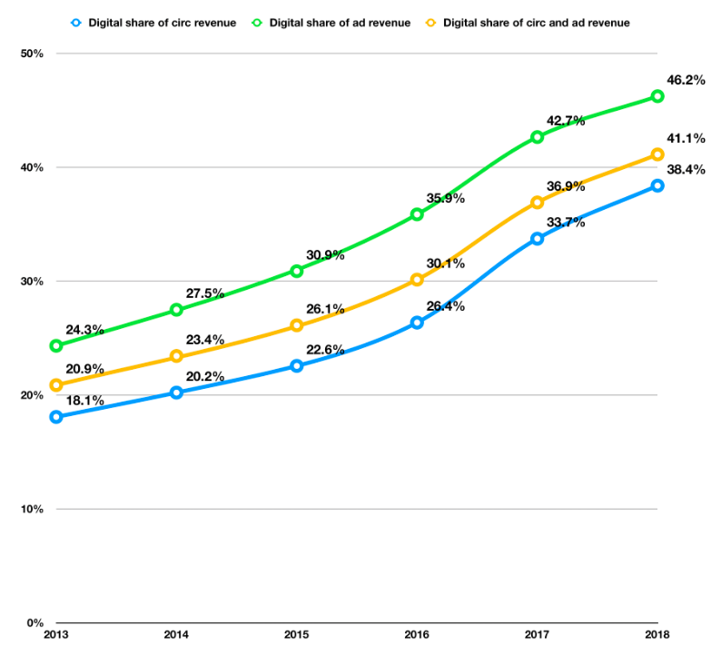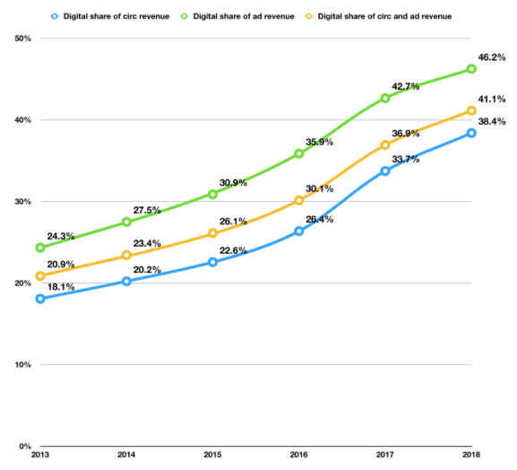 Bottom line: 40% of the Times’s revenue now comes from digital dollars, with 50% soon to follow, says Joshua Benton of NiemanLab. He also includes this nifty chart tracking the growth in digital revenues.