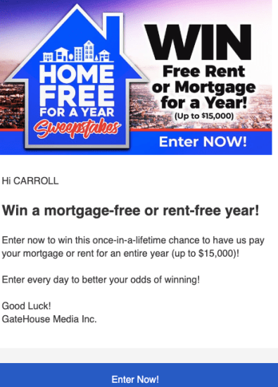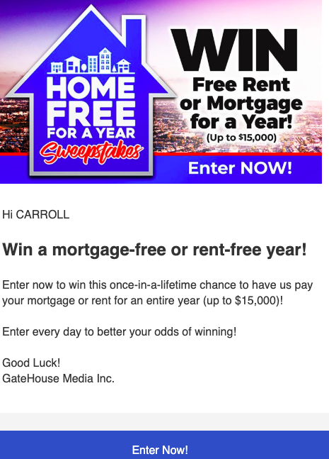 Imagine the hardworking staff’s delight when we received an email from GateHouse Media with the subject line Win a Mortgage-Free or Rent-Free Year!
