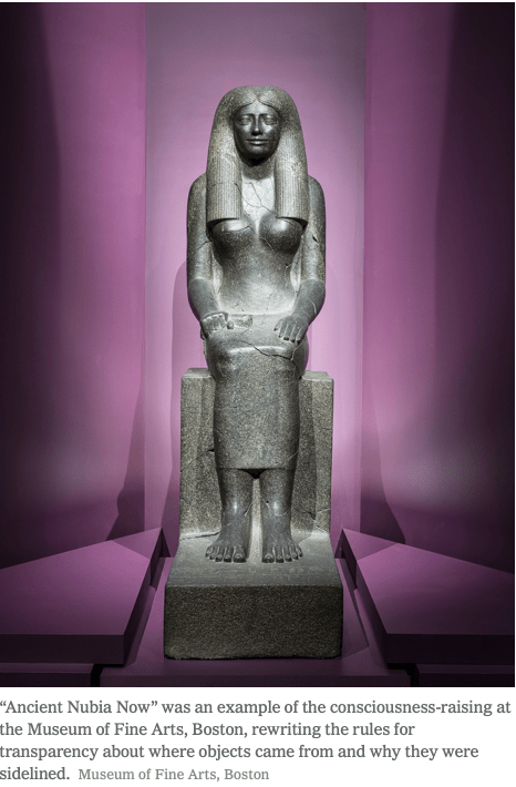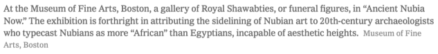 Kicker: “[In] another particularly timely wall label, the show raised questions about the legitimacy of the museum’s ownership of its Nubian work” – in other words, admitting that the MFA, in partnership with Harvard University, essentially looted the Nubian objects, since their permits to excavate, as the wall label further states, “were in fact issued not by the Egyptians and Sudanese, but by British colonial officials.”