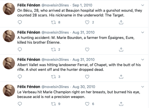 As I’ve previously noted, in his work for Le Matin Fénéon was in many ways the first micro-blogger, so it’s only fitting he has his own Twitter feed.