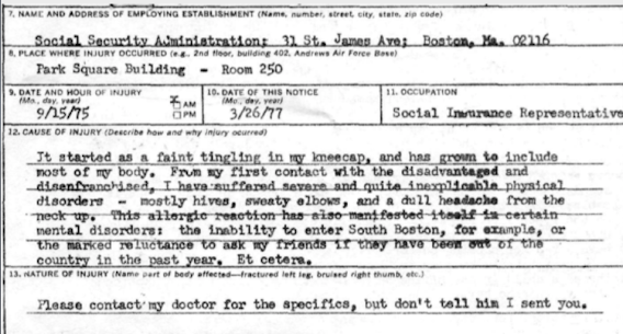 At the same time I made my Boston literary debut by founding, writing, and publishing a newspaper chronicling the madcap antics at the SSA’s Park Square District Office (DO), which on the average day looked like a mashup of Hieronymus Bosch and Monty Python.