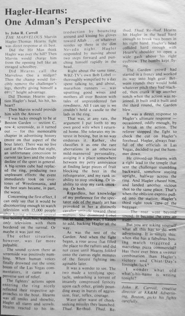 On April 15, 1985 I trundled down to the old Boston Garden with two of my teammates – AdEast editor Greg Farrell and Tab reporter Mark “Tuna Can” Jurkowitz – to catch the closed-circuit telecast of the fight between undisputed middleweight champion Marvelous Marvin Hagler and Thomas “The Hitman” Hearns, the world junior middleweight champion who was moving up in weight class.
