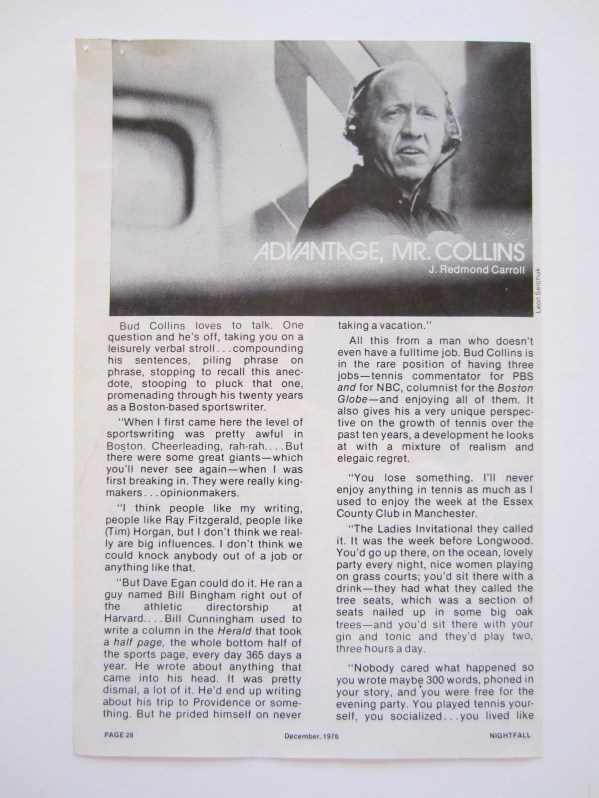 I sat down with crazy pants tennis icon Bud Collins over drinks at the Ritz Bar (his choice), for which I had to pick up the tab, thereby zeroing out whatever I got paid for the piece.