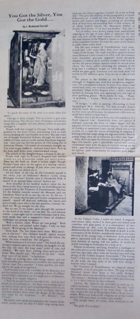 My best efforts, though, were long-form narrative reports like this one reviewing the 1977 King Tut exhibit at Chicago’s Field Museum,