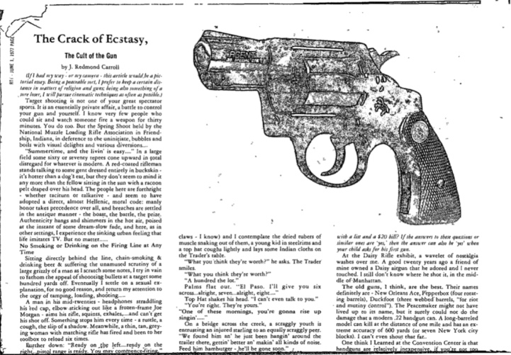 Another piece chronicled the Spring Shoot held by the National Muzzle Loading Rifle Association in Friendship, Indiana – an event my years of watching “Davy Crockett” in the mid-’50s made me eminently qualified to cover.