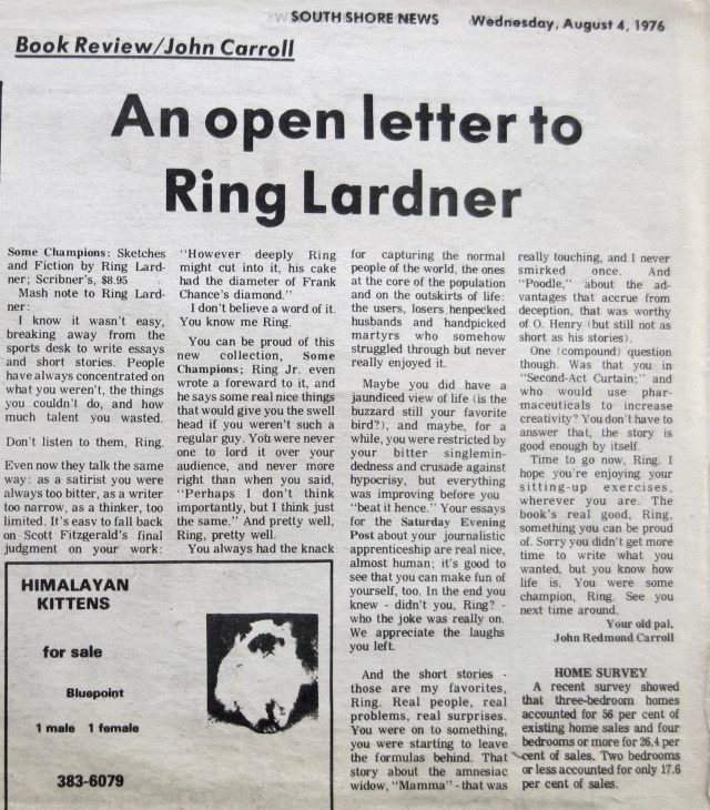 Funny thing – saw my nephew Colin the other week and he said “Karin and I totally don’t get the Ring Lardner thing.” That’s one huge generation gap, no?