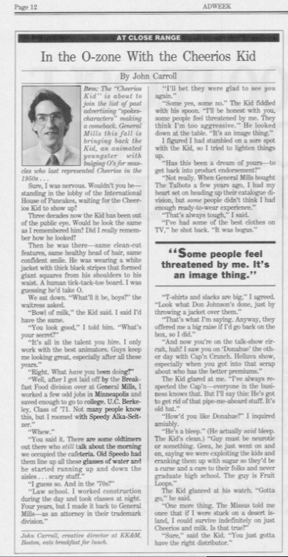 Two weeks later I scored an exclusive interview with the Cheerios Kid. General Mills was bringing him back after he’d been on the shelf – and off the shelves – for 30 years.