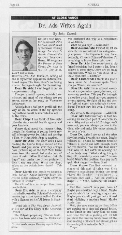 In subsequent months I a) wrote an imaginary boardroom/strategy session of executives looking to change the formula for Pepsi-Cola (the Coca-Cola Company had introduced New Coke several months earlier), b) covered that year’s Hatch Awards as a 15-round heavyweight bout between Rhode Island boutique shop Leonard Monahan Saabye and Boston mega-agency Hill Holliday Connors Cosmopulos (LMS by a knockout), and c) dispensed New Year’s resolutions for clients, agencies, and the communications world at large.