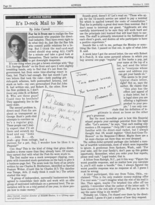 For one stretch of time, I had a lively back-and-forth with the fine folks in the direct mail dodge.