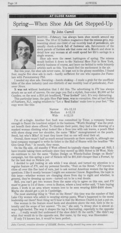Adweek magazine published six regional editions at the time: East, New England, Southeast, Midwest, Southwest, and West. I started in the New England edition and eventually worked my way up to the mothership in New York, appearing for several years in all the editions of the magazine.