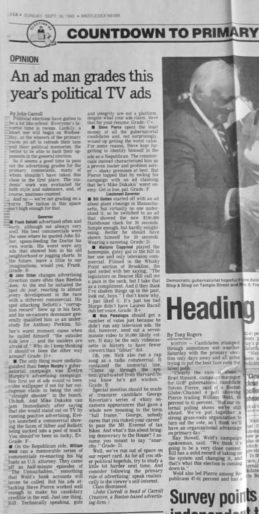 In all, I wrote ten pieces for the Metrowest Town Meeting over the course of three months. In the fall of 1990, Ken Hartnett brought me back to analyze the ads for statewide races in Massachusetts.
