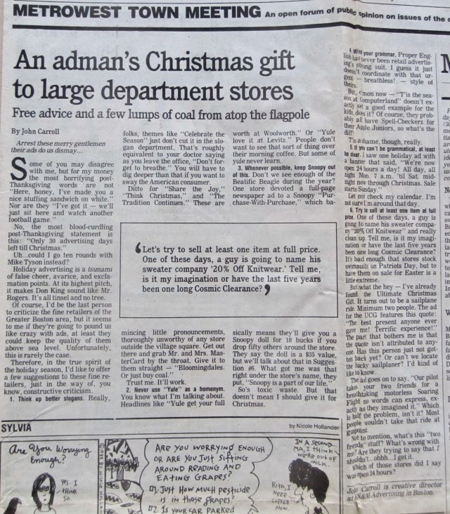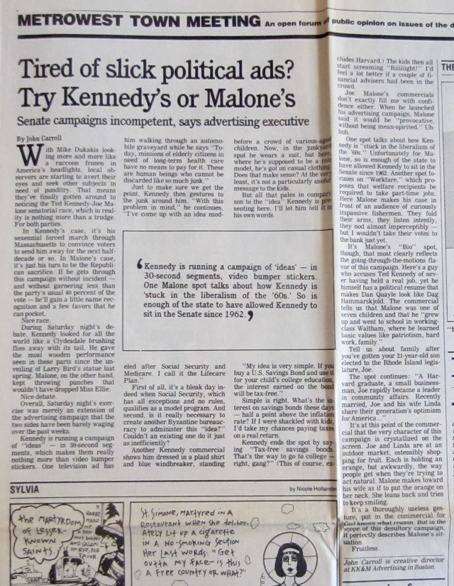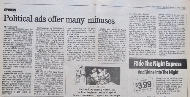 Shortly after that piece, I got bumped up to the flagship paper’s Metrowest Town Meeting, a sort of people’s op-ed page described as “An open forum of public opinion on issues of the day.” I was its advertising critic, starting with political ads.