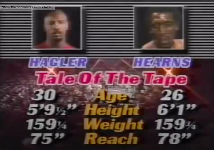 Hagler, the pride of Brockton, was the undisputed hometown favorite, but the Tale Of The Tape looked to favor Hearns in age, height, and reach.