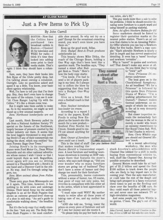 Adweek magazine published six regional editions at the time: East, New England, Southeast, Midwest, Southwest, and West. I started in the New England edition and eventually worked my way up to the mothership in New York, appearing for several years in all the editions of the magazine.