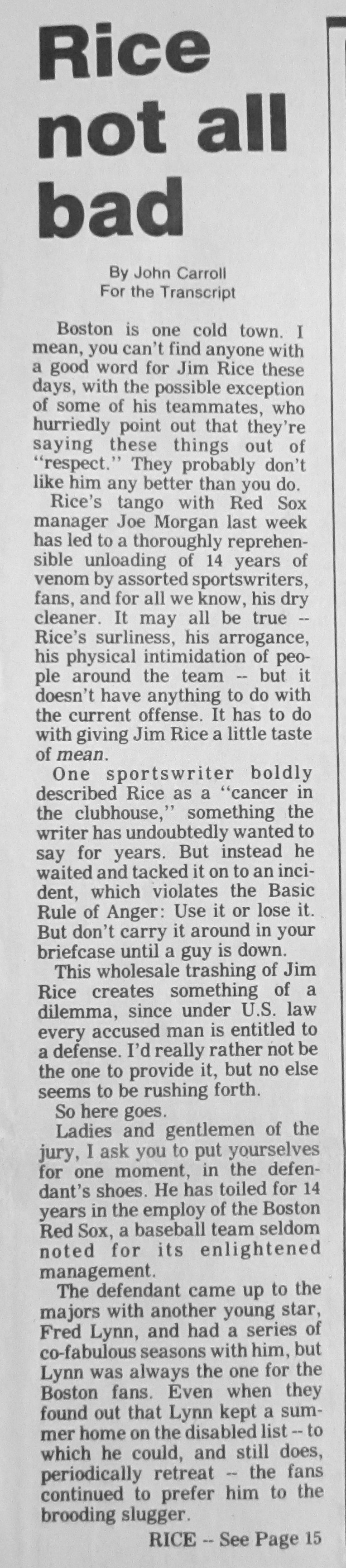 I started writing about sports – of all things – at the MN’s sister publication, The Daily Transcript. My first piece was an amicus brief for Red Sox left fielder Jim Rice, who days earlier had manhandled manager Joe Morgan after he pulled the dyspeptic slugger for a pinch hitter in the eighth inning of a game against the Minnesota Twins..