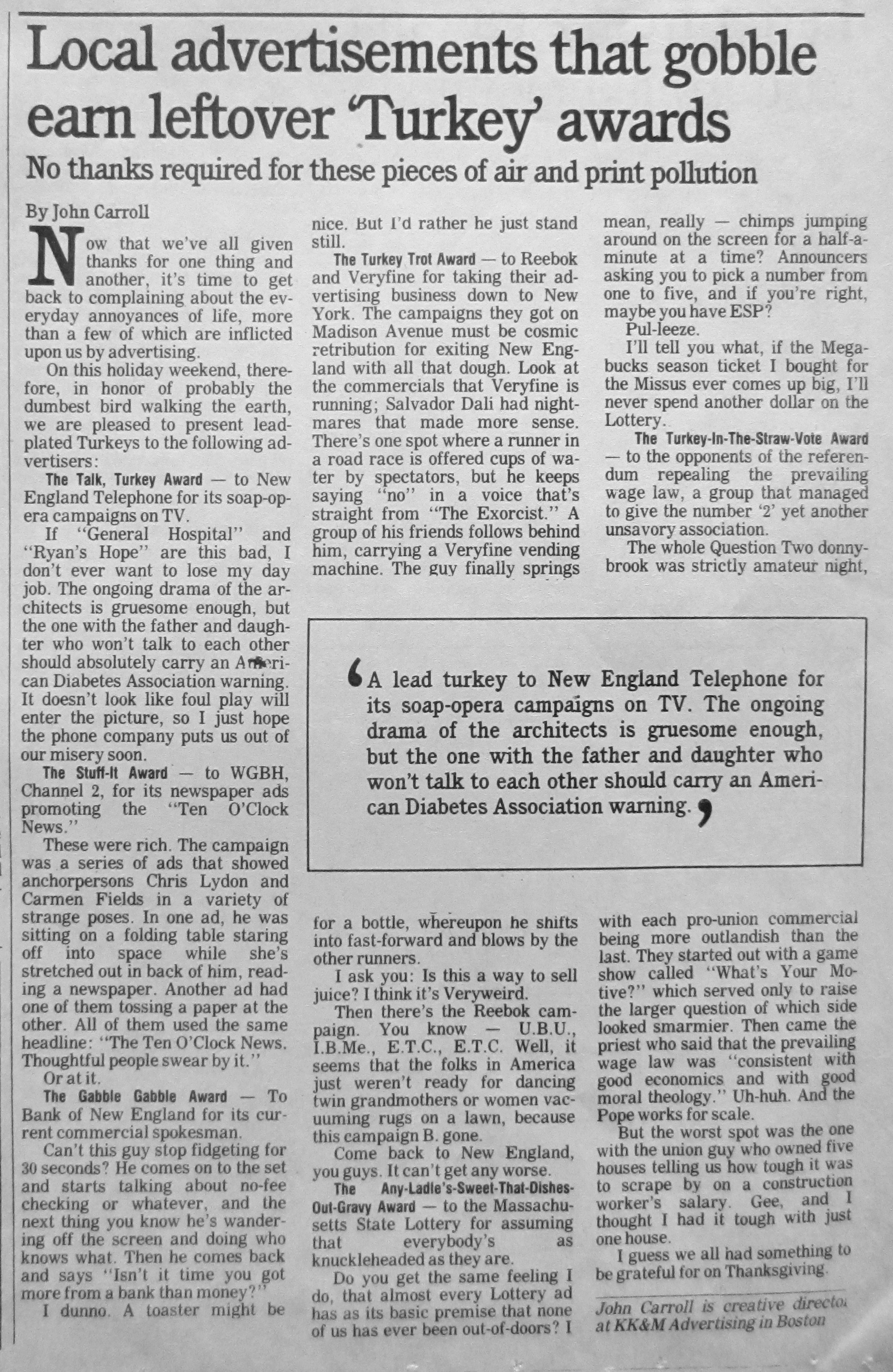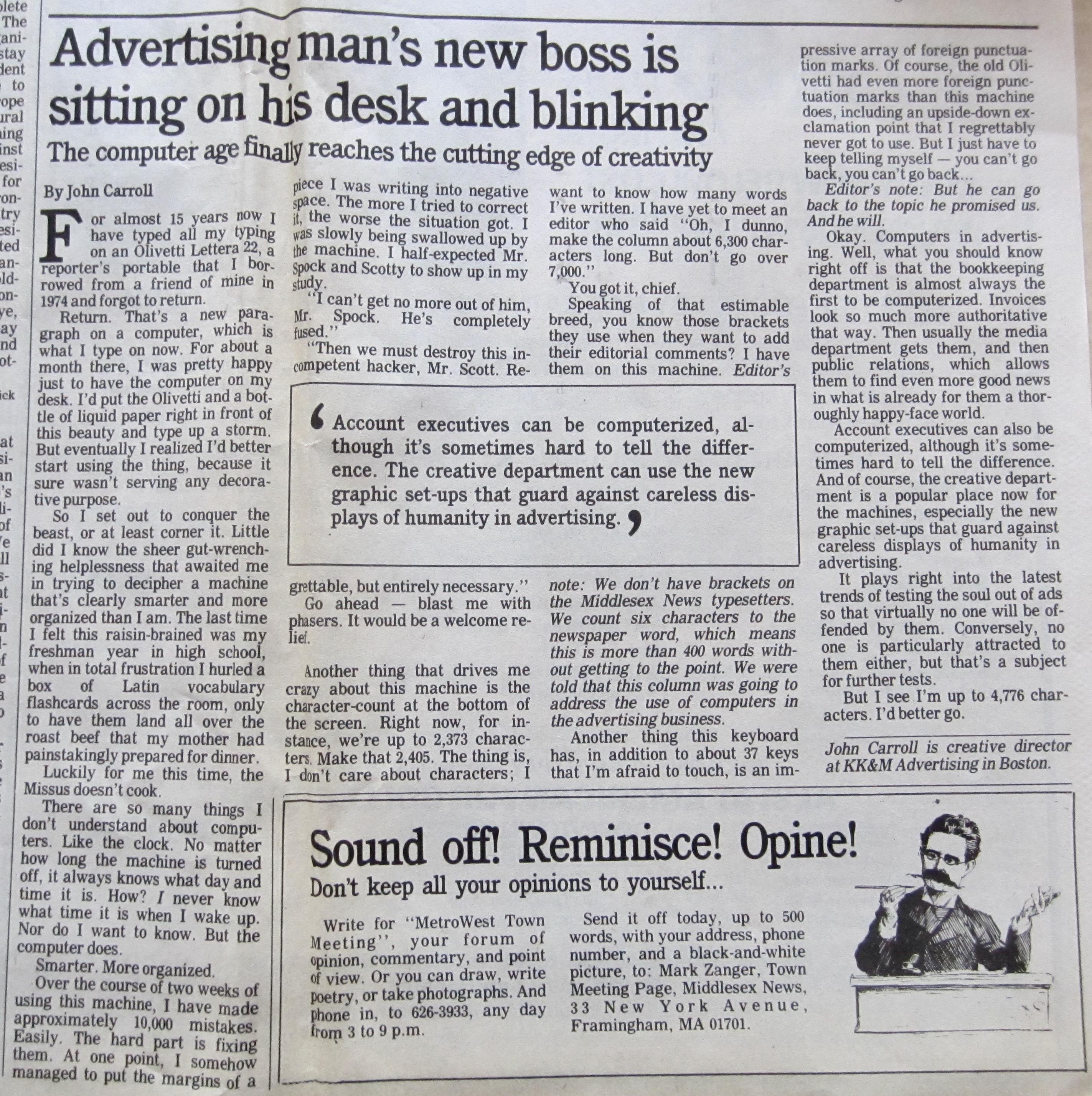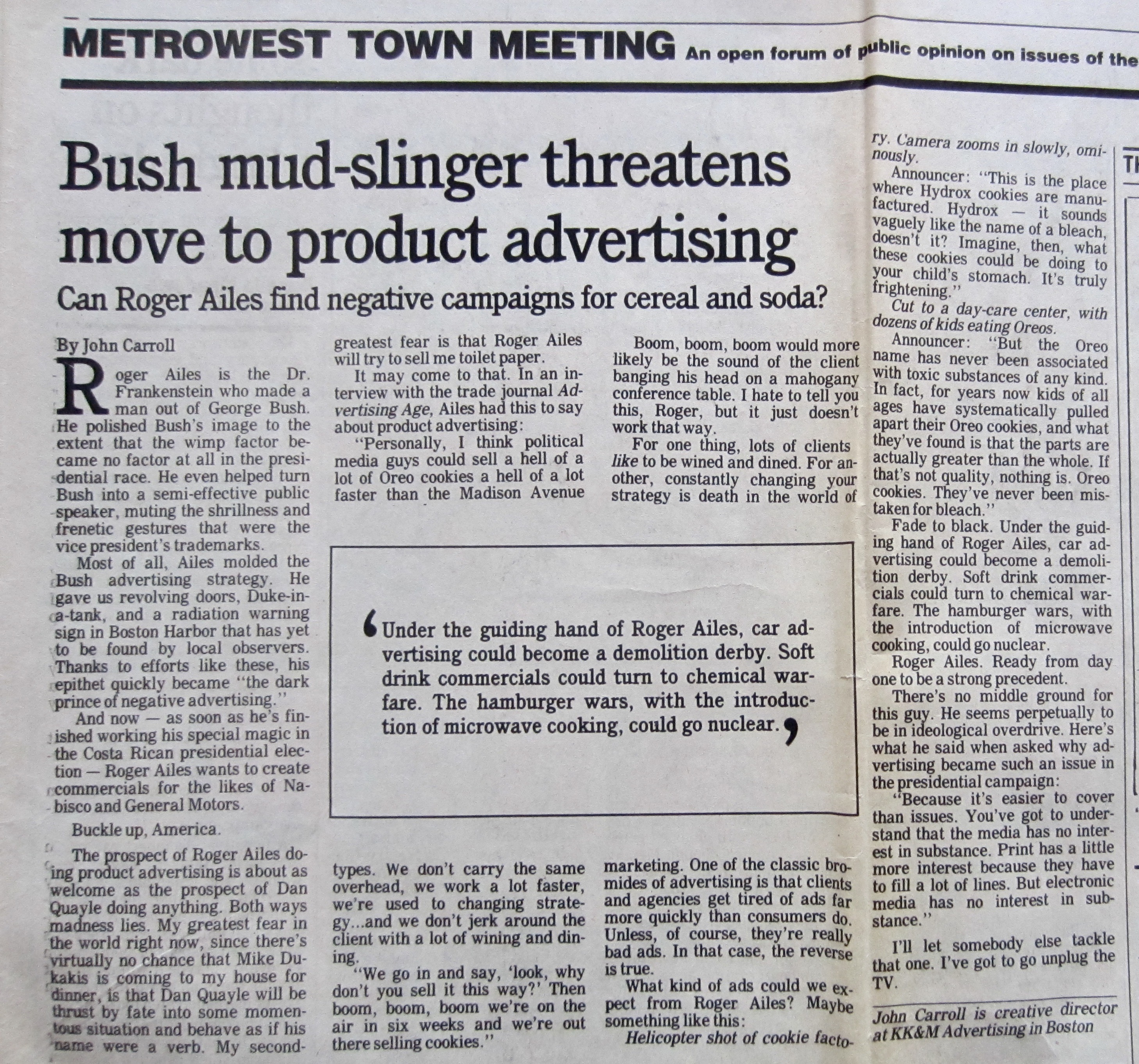 Shortly after that piece, I got bumped up to the flagship paper’s Metrowest Town Meeting, a sort of people’s op-ed page described as “An open forum of public opinion on issues of the day.” I was its advertising critic, starting with political ads.