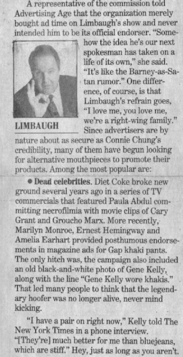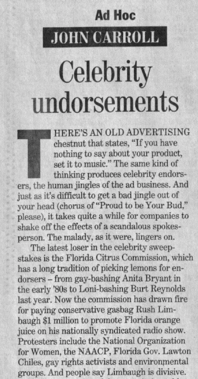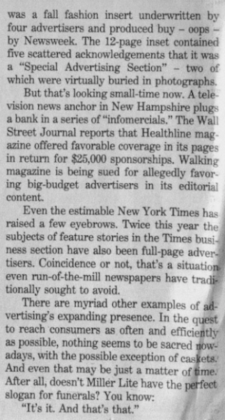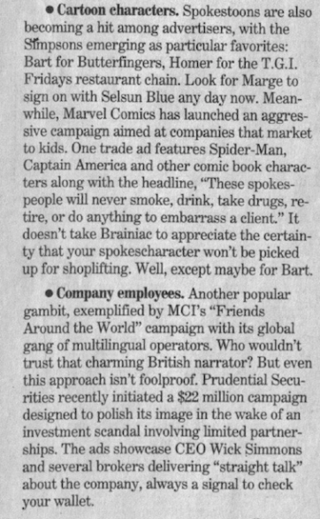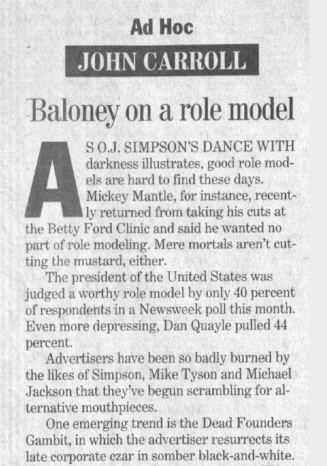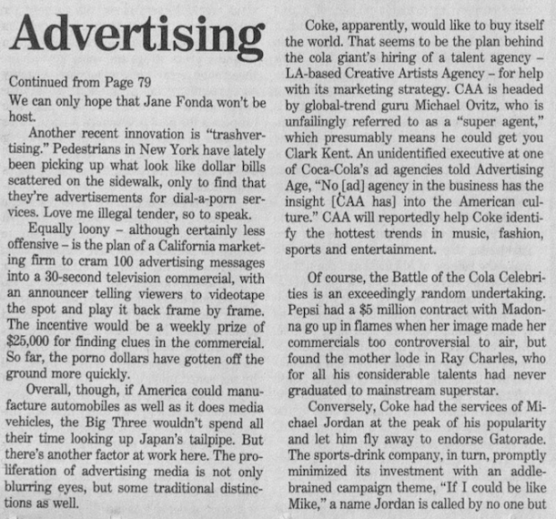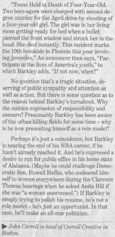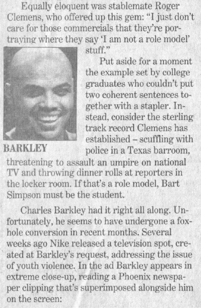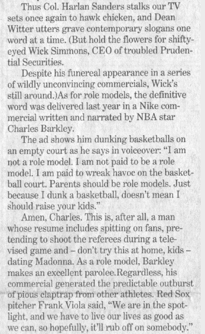 Columns also ventured into the arena of sports marketing, such as this piece about Charles Barkley, who insisted he was not a role model – until he was. (Keep in mind that this is the same Charles Barkley who claimed he was misquoted in his autobiography.)