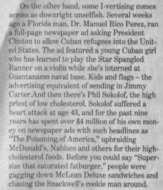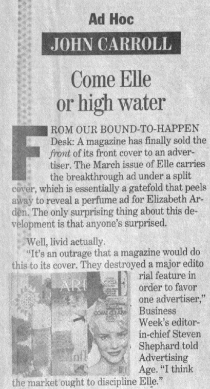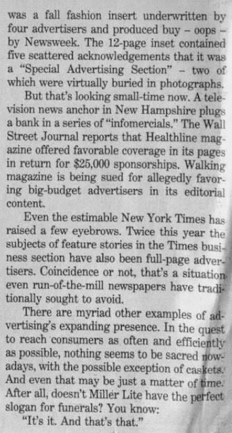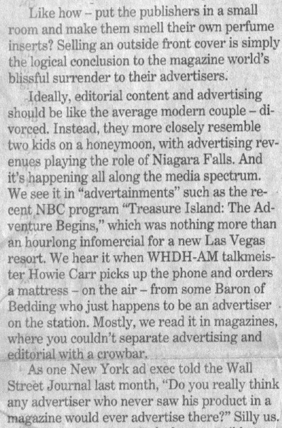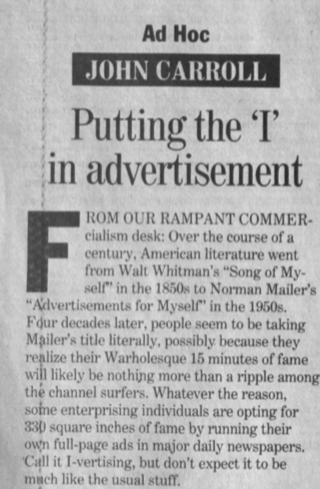 In another coup for the column, I’m Ivory-soap certain that Ad Hoc introduced to the marketing vernacular the term I-vertising – individuals opting for 330 square inches of fame by running their own full-page ads in major daily newspapers.