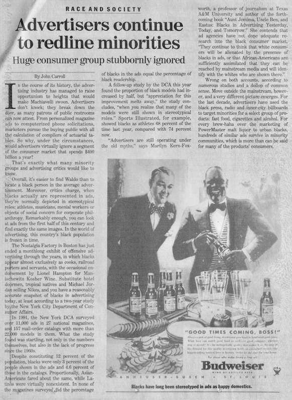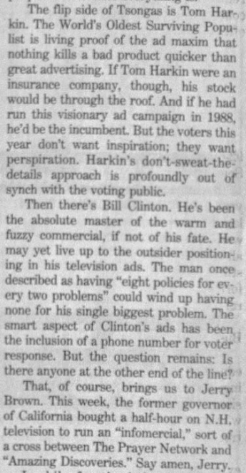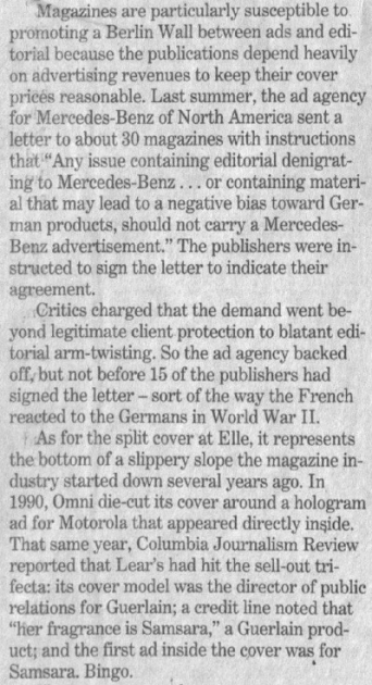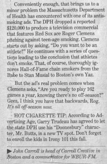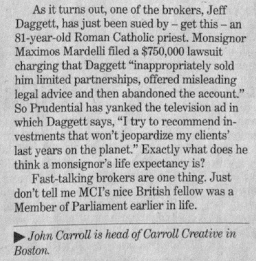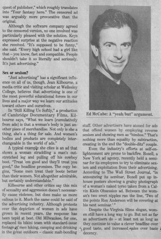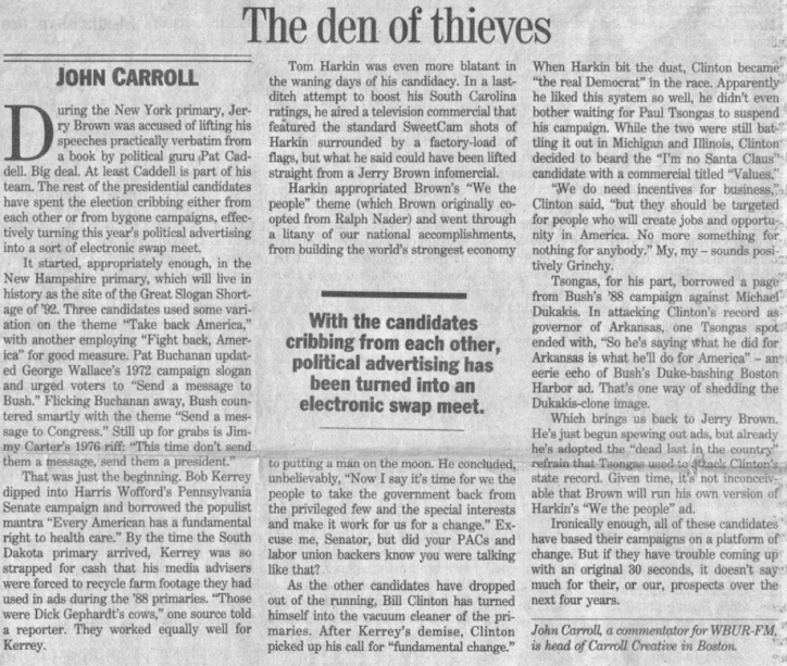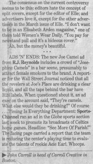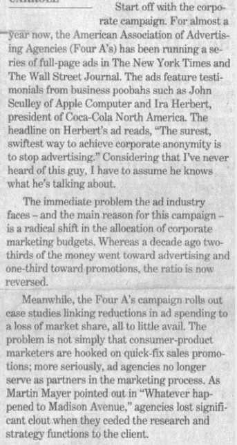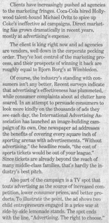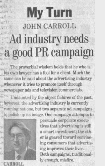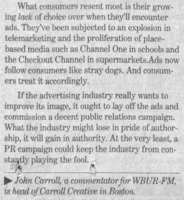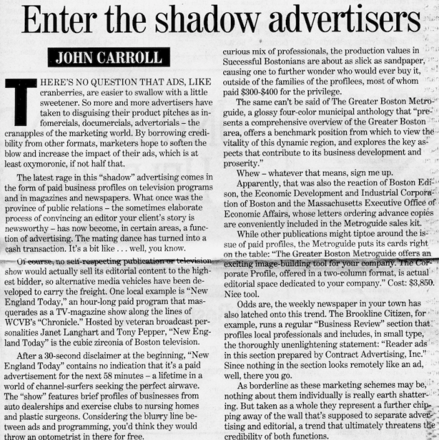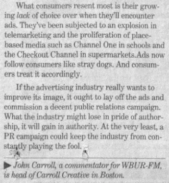 At the end of ’92 I began pitching Globe business editor Steve Bailey, with some initial success, such as this piece about the image problems the advertising industry suffered.