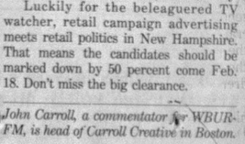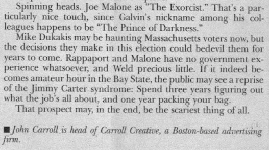 Nineteen-ninety was a gubernatorial election year in Massachusetts, so I produced a lot of ‘BUR commentaries about political ads that fall. And since Boston University president John Silber was the Democratic nominee for governor, my commentaries had their own political aspect, given that BU owned WBUR at that time (and still does).