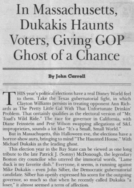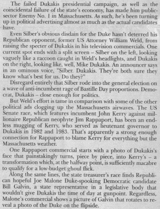 Regardless, I shortly thereafter filed these two pieces about the campaign ads run by Democratic presidential nominee Mike Dukakis.