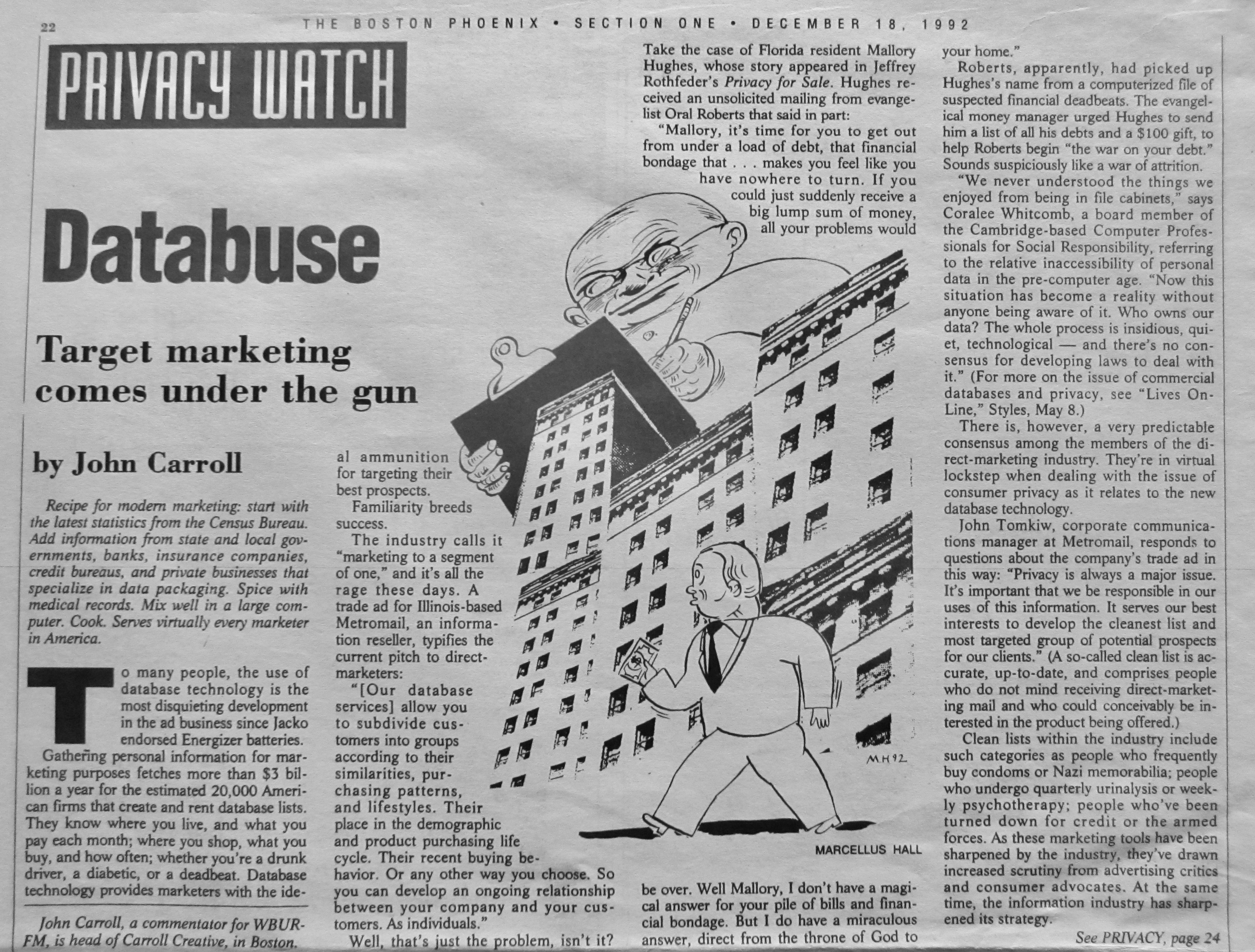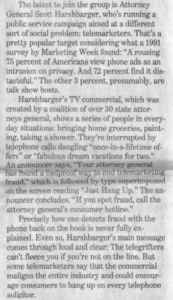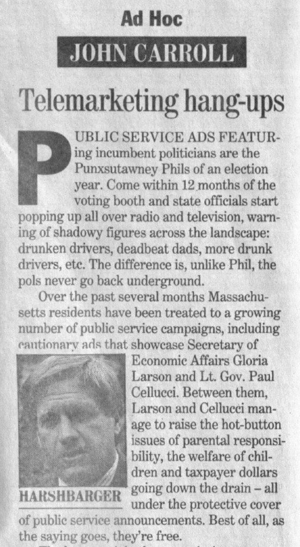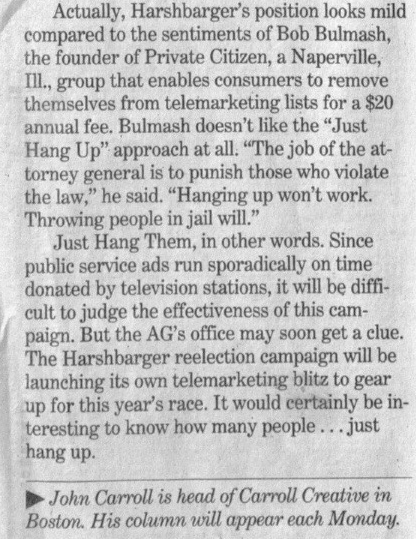 And so in January my weekly column – which I had dubbed Ad Hoc – debuted with a piece that mildly criticized Massachusetts Attorney General Scott Harshbarger’s crusade against telemarketers.