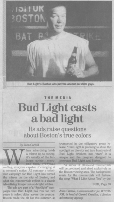 Over all, the ad consists of wall-to-wall burly white guys whose lifetime goal is probably to shoot their IQs on the golf course. Mark Schupp, Bud Light Product Manager, insisted that the absence of minorities in the two ads that aired that summer was inadvertent.